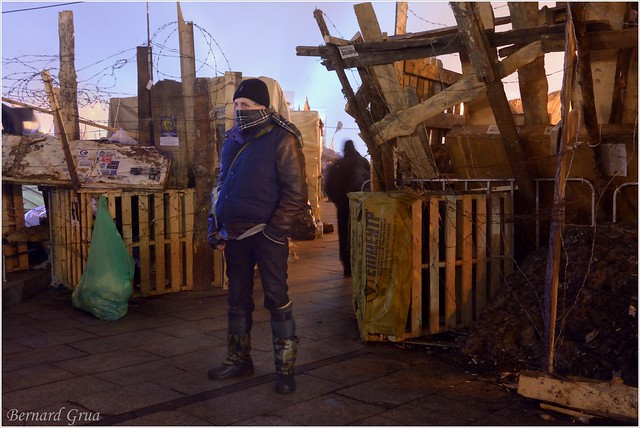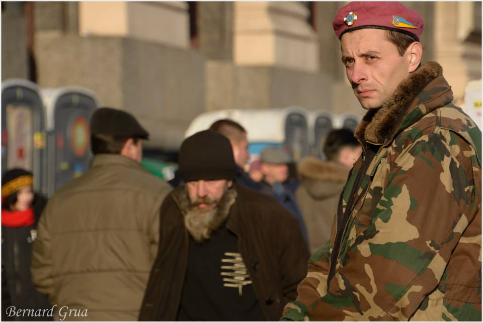 L’ambiance était lourde.Tous ces gens masqués, ces boucliers, ces casques militaires, ces battes de base-ball, ces « uniformes » devant le bâtiment étaient sinistres.Visiblement la bonne humeur avait disparu. Maïdan était sillonné par des sections, elles aussi, casquées et entièrement équipées. Le lendemain, j’ai cherché tous les protestataires dont j’avais fait des portraits en décembre. Je venais avec des tirages papiers que je voulais leur donner. Je ne retrouvais personne. Pavlo , d’Ivano-Frankivsk, m’a téléphoné : « Fais-tu beaucoup de prises de vue ? ». Je lui ai répondu que je trouvais le climat bizarre. Je ne savais plus quoi photographier. Je sentais que beaucoup de choses m’échappaient.