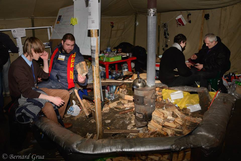 Sur Maïdan, non plus, ma première vision n’avait rien de surprenante. Je retrouvais ce que j’avais vu en photos ou en vidéo. En revanche, même si j’y étais un peu préparé, je n’aurais pas pu imaginer à quel point les gens étaient calmes et à quel point ils étaient ouverts les uns vis à vis des autres. Quand on commençait une conversation, avec qui que ce soit, il n’y avait plus moyen de la stopper.On ne pouvait s’en sortir qu’en disant : « Слава Україні! » (Gloire àl’Ukraine) ! Ce à quoi l’interlocuteur répondait « Героям Слава! » (Gloire aux héros) et vous serrait la main ou vous embrassait, quand il s’agissait d’une baboussia (Grand-mère).