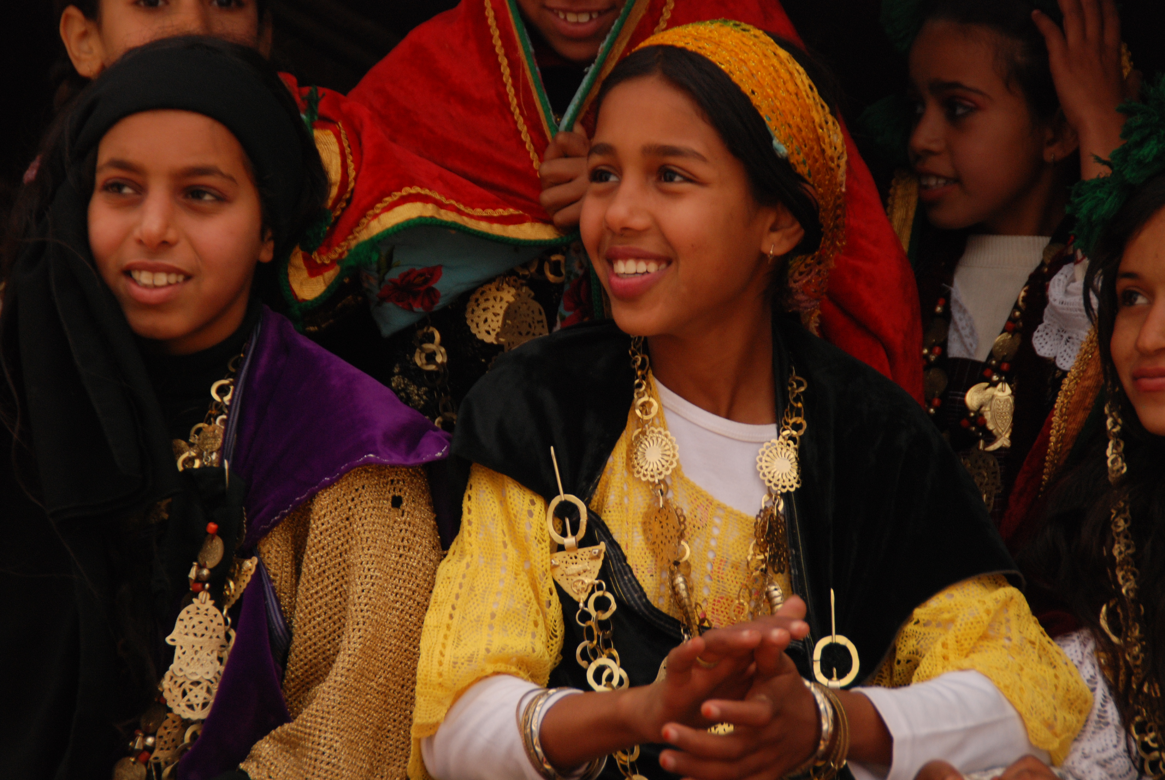 Au fait, le festival ? Point intéressant, tout est totalement gratuit. Cela se passe l’après-midi. Les spectateurs sont dans des tribunes qui regardent vers le désert. Le long des tribunes, il y a une large piste où passent les chevaux, les chameaux et les danseurs. De l’autre côté de la piste (vers le désert) il y a un grand demi-cercle de tentes de nomades, dans lesquelles se trouve tout un petit monde charmant et costumé. Ses habitants jouent un ensemble de scènes (caravane du désert, arrivée au puit, mariage traditionnel, « combat » de chameaux, chasse au lièvre par des lévriers etc..). C’est malgré tout bien loin des spectateurs pour en profiter et pour faire des photos. D’autant qu’il est difficile de zoomer fortement en raison de la faible lumière. Les commentaires n’aident guère. Ils sont tous en arabes. Si l’on a raté un épisode, ce n’est pas grave car les mêmes scènes sont rejouées tous les après-m
