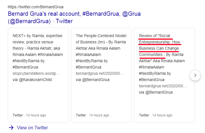 There is no actual evidence of Ramla Akhtar « Social (Internet) Media Strategy. Editorial ». The very few text we can find under Ramla Akhtar’s names have creative commons status. This is not the work of an editorialist or a journalist, as she also consider to be. She focuses on Facebook (which was, may be, new in 2008 in Pakistan) with small audiences and, recently, she became prolific on Twitter . There, the writing is terribly poor and, we should admit, full of slang as evidenced in this anthology. No publications can be found on the web under the aliases, Rmala Alam or Rmala Al’Aalam, the ones she has used since 2013.