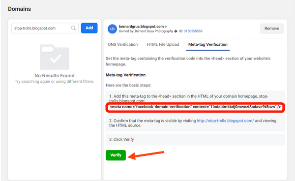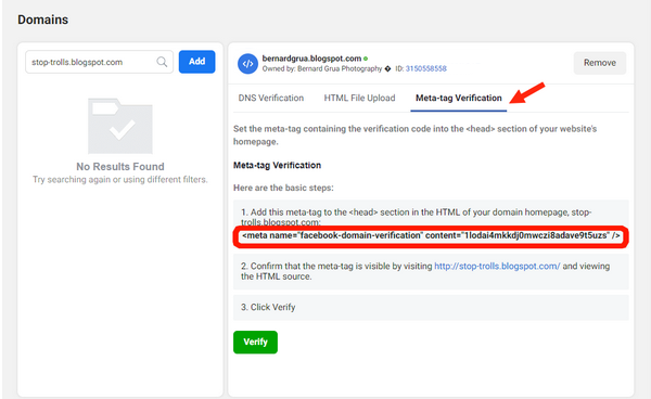 Vous devez créer une page que vous qualifierez de « business » sur Facebook. Vous pouvez aussi donner ce statut à une page que vous gérez déjà. C’est le cas de ma page Bernard Grua Photographe. Vous allez déclarer votre « domaine » à cette page business. Puis vous allez insérer une clef « Meta-tag » Facebook dans le code de votre site Blogspot. Cela devrait, normalement résoudre le problème.