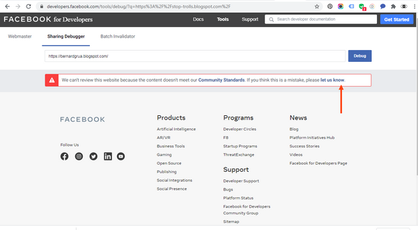 - Soit vous avez partagé du contenu non autorisé par Facebook notamment dans l’image de tête d’un article, dans l’URL de l’article, dans son titre ou dans sa description. Supprimez ce contenut et expliquez cela à Facebook. Dans les deux cas, cliquez sur « let us now ».