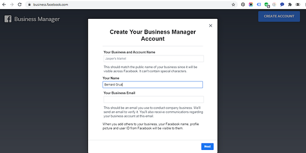 Complétez le premier formulaire en renseignant le nom de votre page, votre nom et votre adresse email. Puis cliquez sur « Next ».