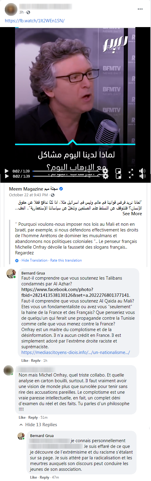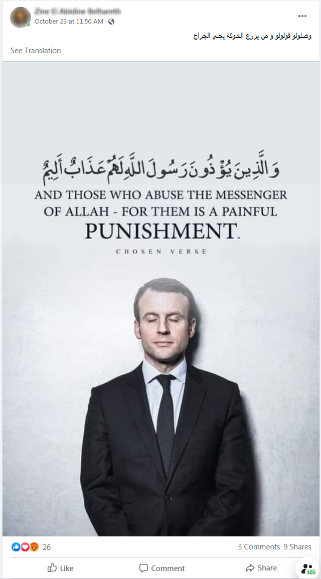 Que faut-il donc penser du président de cette association culturelle de Tunis, dont on peut voir les captures d’écran ci-dessus? Non seulement il justifie l’égorgement et la décapitation de ce malheureux professeur, mais, en plus, il appelle à un nouvel assassinat, celui du Président Macron.