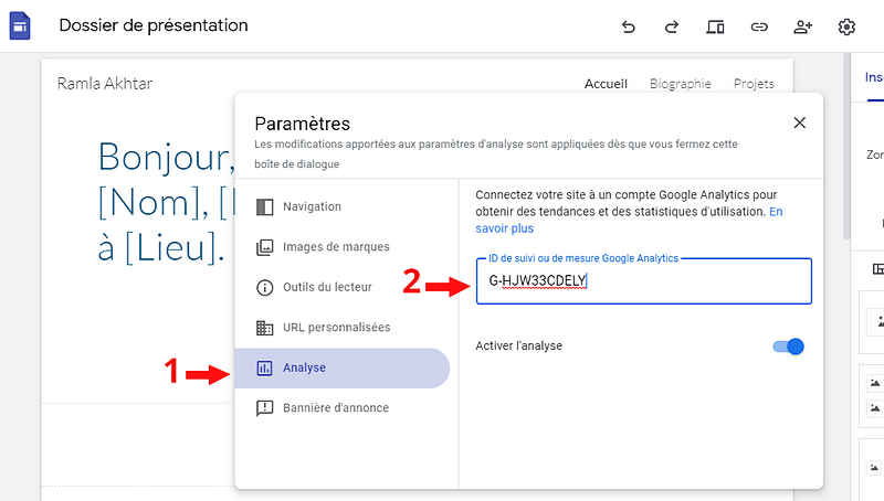 1.3. Copier la clef fournie par Google Analytics - Google Sites: insérer la clef Google Analytics.