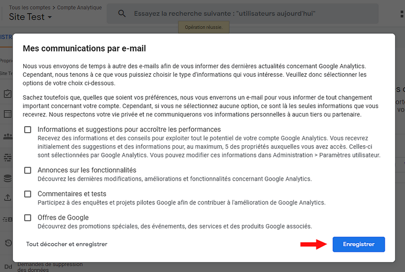 Laissez tout décoché si vous ne voulez pas recevoir d’emails de Google Analytics puis « Enregistrer ».