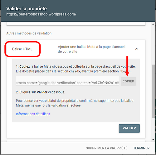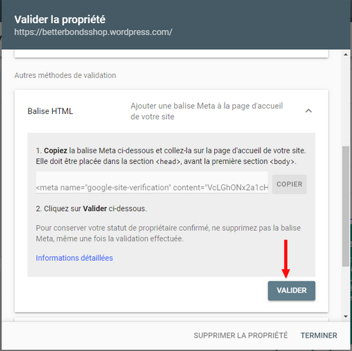 2.2. WordPress: collez la balise HTML et mettez votre site à jour. - Google Search Console: faites valider la clef insérée dans votre site.