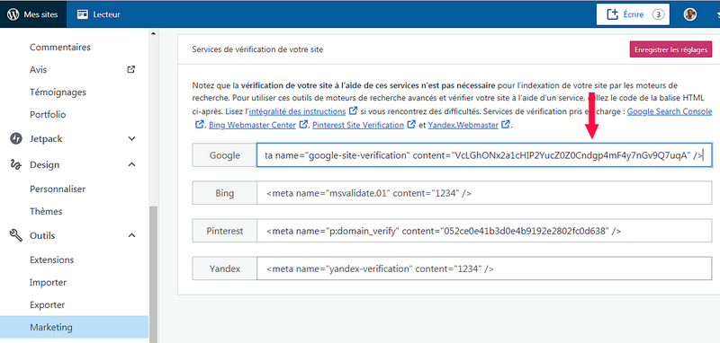 Cliquez sur « Enregistrer les réglages » pour que votre site soit bien mis à jour par la meta balise HTML.