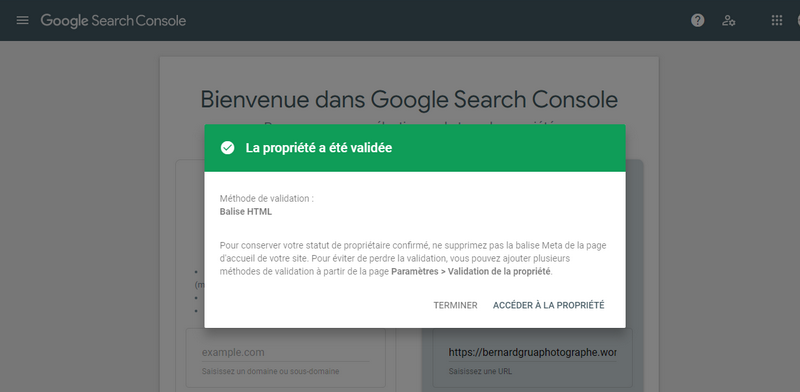 La Google Search Console confirme que la propriété est validée, c’est à dire que votre site WordPress est lié à la console. Vous pouvez y accéder et lancer des requêtes d’indexation pour vos pages et pour vos articles.