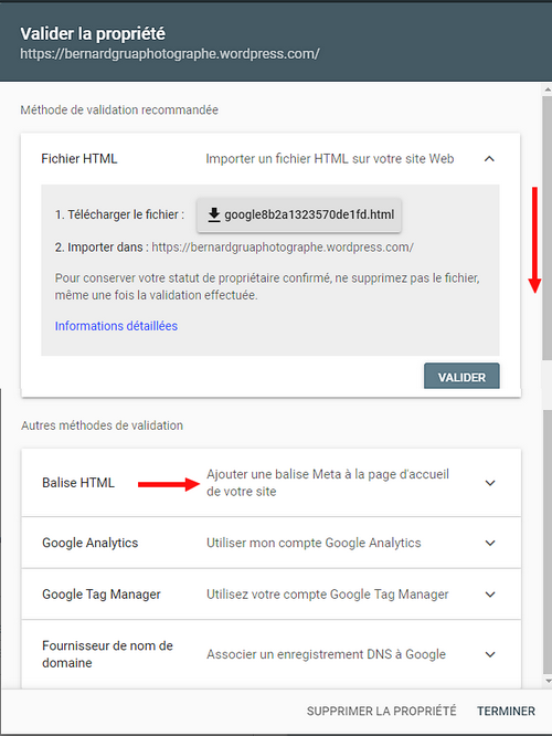 3. Google Search Console: faites valider la clef insérée dans votre site.