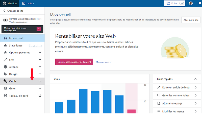 L’éditeur est l’endroit où vous régidez les articles et préparez les pages de votre site WordPress. Dans la colonne de gauche descendez jusqu’à « Outils ».