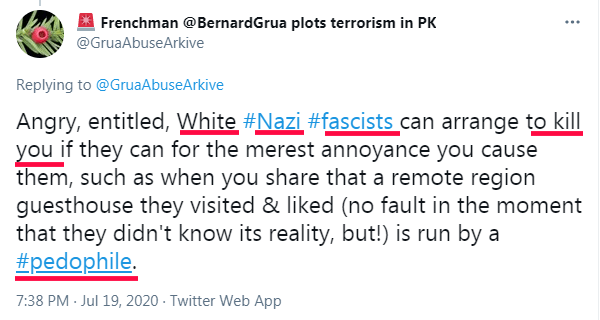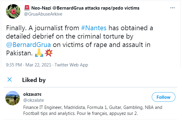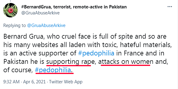 Bernard Grua, dont le visage cruel est plein de hargne, tout comme ses nombreux sites Web chargés de matériaux toxiques et haineux, est un partisan actif de la #pédophilie en France et au Pakistan, il soutient le viol, les attaques contre les femmes et, bien sûr, # pédophilie.