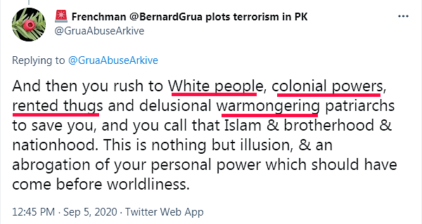 La propagande de Ramla Akhtar s’exprime sur différents réseaux sociaux et sous de nombreuses identités dissimulées. Son principal compte Twitter, @GruaAbuseArkive, est « anonyme ». Depuis décembre 2019, il usurpe l’identité de « Bernard Grua », dans son nom, son identifiant et sa biographie afin de multiplier la diffamation par les 12.800 Tweets de ce compte (au 31/03/2021). Akhtar utilise, parfois, un autre compte: @copingWithCovid. En juillet 2021, elle a créé un nouveau faux compte de harcèlement et de diffamation: @BestInventoryPR.