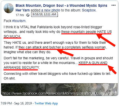 « Ces gens de montagnes NOUS (Nda: les Pakistanais sunnites de couleur) HAISSENT TANT . Il peuvent attaquer et massacrer une femme isolée. AYEZ UNE ARME ET PREVOYEZ VOTRE SECURITE.