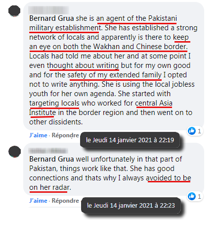 Elle est une agente de l’establishment militaire. Elle est là pour garder un œil sur la frontière du Wakhan (Afghanistan) et de la Chine. J’ai même pensé écrire sur elle mais pour ma sécurité et celle de ma famille, je m’en suis abstenu. Pour son action, elle utilise les jeunes sans emploi. Elle a commencé à cibler les gens locaux qui travaillaient pour le « Central Asia Institute » (remarquable ONG de scolarisation), dans la région frontalière puis elle est passée à d’autres dissidents. J’ai toujours évité de me trouver sous ses radars.