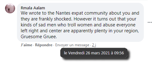 Note: Il faut comprendre que la municipalité et la police de Nantes, destinataires principales des dénonciations calomnieuses contribuant au harcèlement diffamatoire, en sont complices par passivité. Elles n’ont jamais donné suite aux nombreuses demandes de rendez-vous exprimées sur place, par emails et par tweets. Le commissariat principal de Nantes a même refusé, à quatre reprises, d’enregistrer la plainte pour harcèlement et diffamation avant d’empoigner le plaignant et de l’expulser du bâtiment. Pourtant, les forces de l’ordre bénéficient d’un module spécifique et prioritaire de signalement sur Twitter.