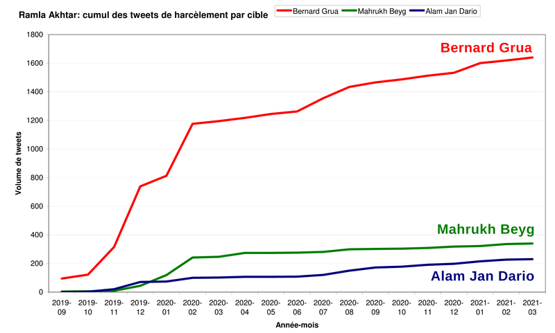 - Bernard Grua, @bernardgrua, Français résidant à Nantes, auteur du rapport du 13 juin 2019 -> 1.639 tweets. Notons qu’en France des peines de prisons ont été prononcés contre des harceleurs ayant adressé moins de 200 tweets à leur victime (soit huit fois moins).