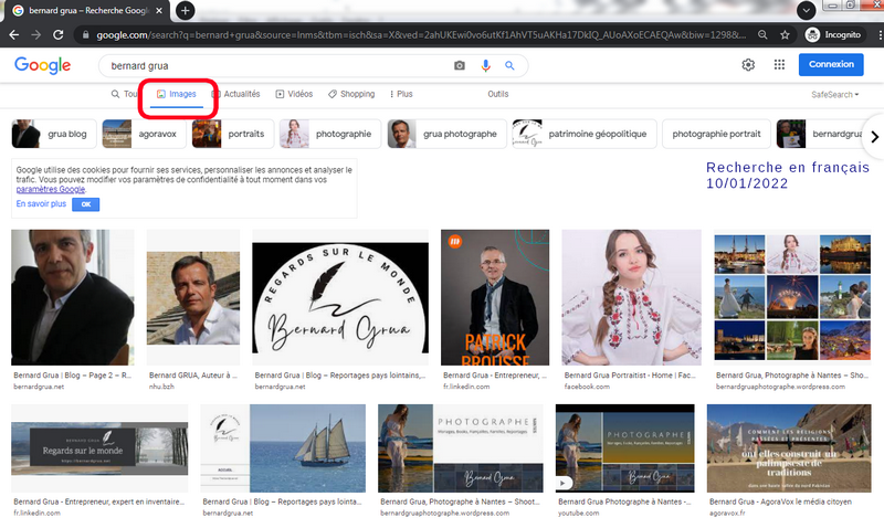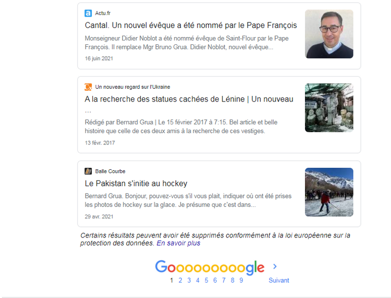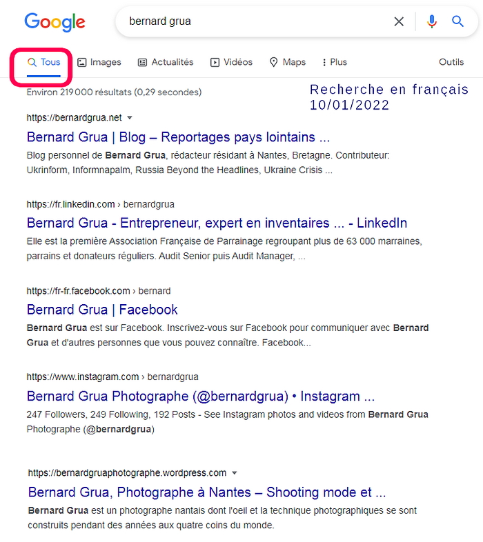Voici ci-dessous la fenêtre de recherche en navigation privée, où vous pouvez taper votre recherche. J’entre – Bernard Grua – de la manière la plus simple dont les gens rechercheront des informations à mon sujet.