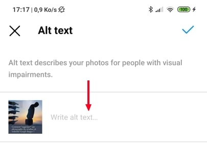 Sur Instagram, vous devrez d’abord publier votre post complet avant de venir modifier cette publication avec votre texte alternatif. Certains auteurs indiquent qu’une modification Instagram doit intervenir moins d’une demi-heure après la publication, sinon celle-ci serait pénalisée en voyant son audience limitée.