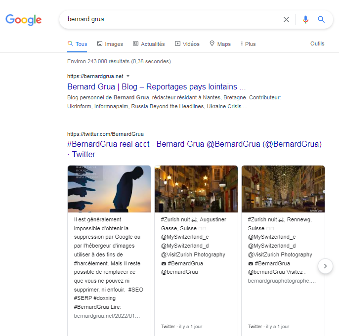Votre tweet avec une image bien renseignée est, quasi immédiatement, mis en avant par Google sur votre carrousel Twitter, sous réserve que vous avez au moins deux autres publications de qualité équivalente.