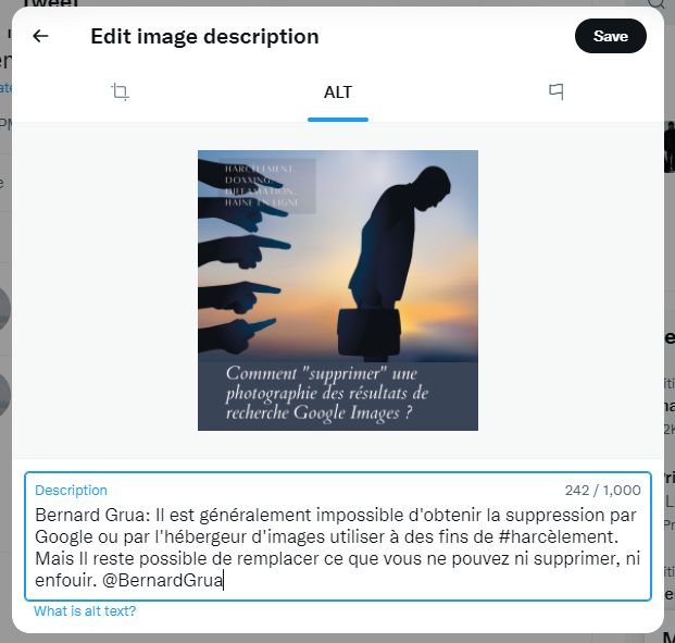 Renseignez le champ « description » avec votre texte alternatif. Puis cliquez sur « Save » (sauvegarder) et « Tweet ».