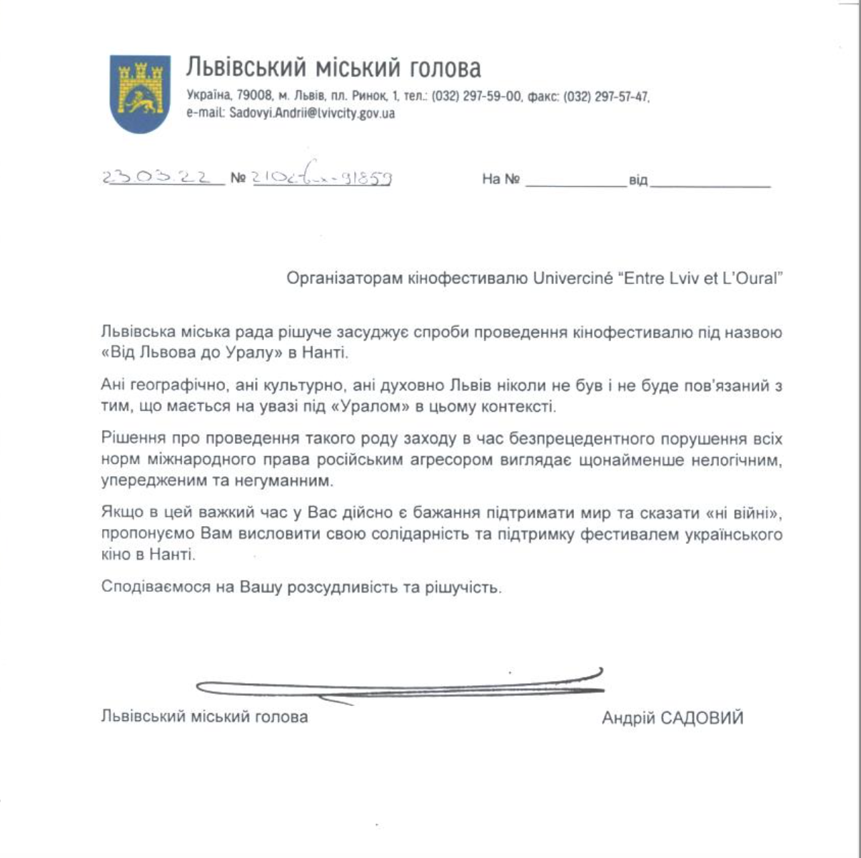 Lettre du maire de Lviv aux organisateurs, refusant que le nom de sa ville soit instrumenté par le Festival du film russe.