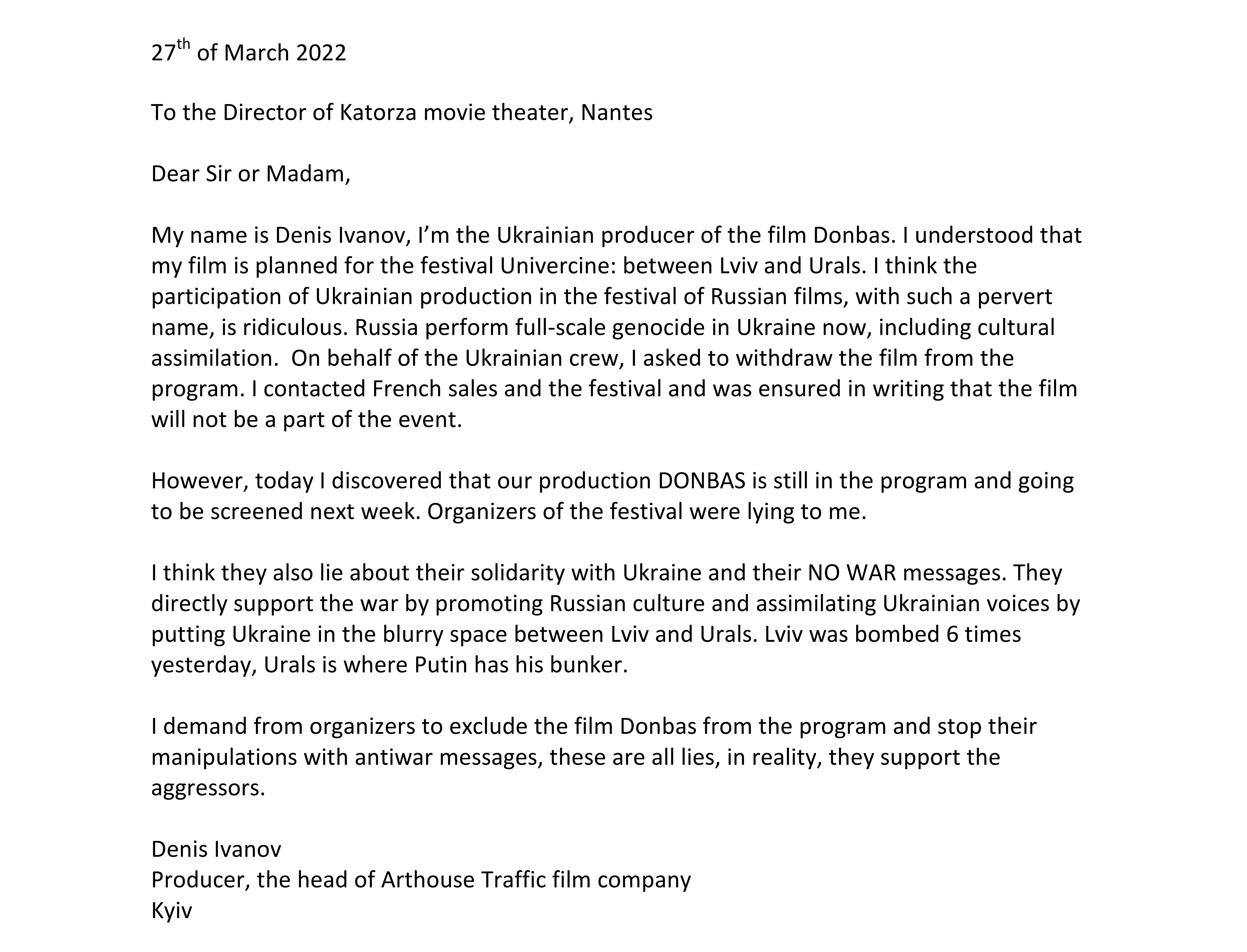 Lettre au cinéma Katorza de Denis Ivanov, producteur du film « Donbass », refusant que son film soit projeté lors du Festival du film russe.