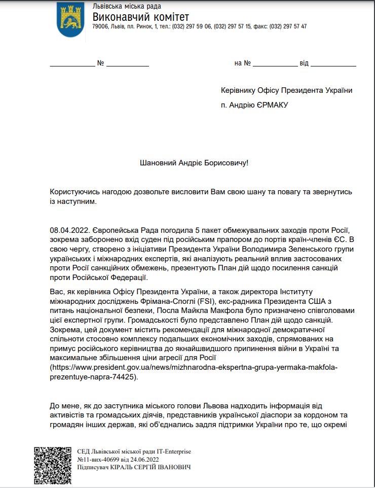 В рамках справи російського судна «Shtandart» в порту міста Ля Рошель, міська рада м. Львів просить адміністрацію предидента України, експертну групу Єрмака-Мак Фола та Європейську комісію перевірити в усіх портах Європейського союзу, дотримання 5-го пакету європейських санкціій щодо Росії, пов‘язаних з вчиненням воєнних злочинів і злочинів проти людства. Тут буде предсталений лист-звернення Сергія Кіраля, заступника мера, до згаданих вище інстанції.