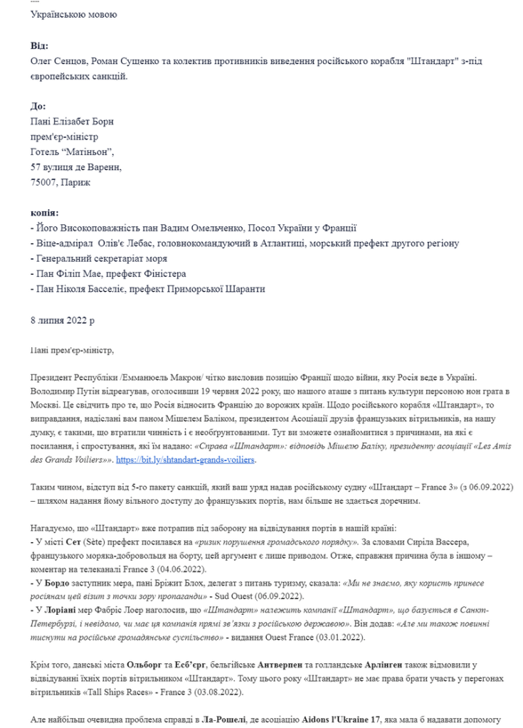 Dear friends, together with my brother and former political prisoner of the Kremlin, Oleg Sentsov, we joined the initiative of the Ukrainian patriots of France and the benevolent French people, leaders of public opinion, representatives of public movements and associations and have signed an open letter, an appeal to the French Prime Minister Elizabeth Borne asking for the prohibition of free access to French ports of the sailboat « Shtandart » under the Russian flag…