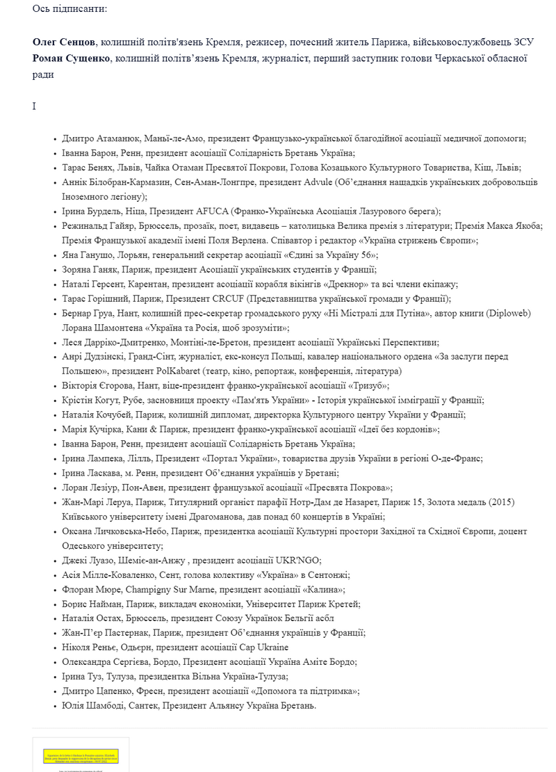 Dear friends, together with my brother and former political prisoner of the Kremlin, Oleg Sentsov, we joined the initiative of the Ukrainian patriots of France and the benevolent French people, leaders of public opinion, representatives of public movements and associations and have signed an open letter, an appeal to the French Prime Minister Elizabeth Borne asking for the prohibition of free access to French ports of the sailboat « Shtandart » under the Russian flag…
