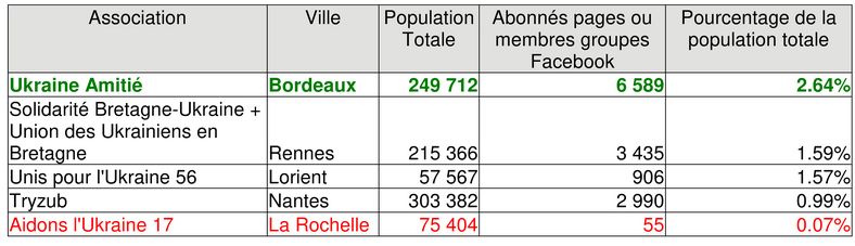 La page Facebook Aidons l’Ukraine 17 a été lancée le 29 avril 2022. Elle n’a produit que trois publications, la dernière date du 3 mai 2022. Elle possède seulement 55 abonnés au 26 juillet 2022. Comparons ce chiffre avec celui d’autres associations. Ces données ne suffisent pas, normalement, à déterminer l’importance de chaque organisation. Néanmoins, compte tenu de l’ampleur du différentiel, il sera possible d’émettre des conclusions pertinentes.