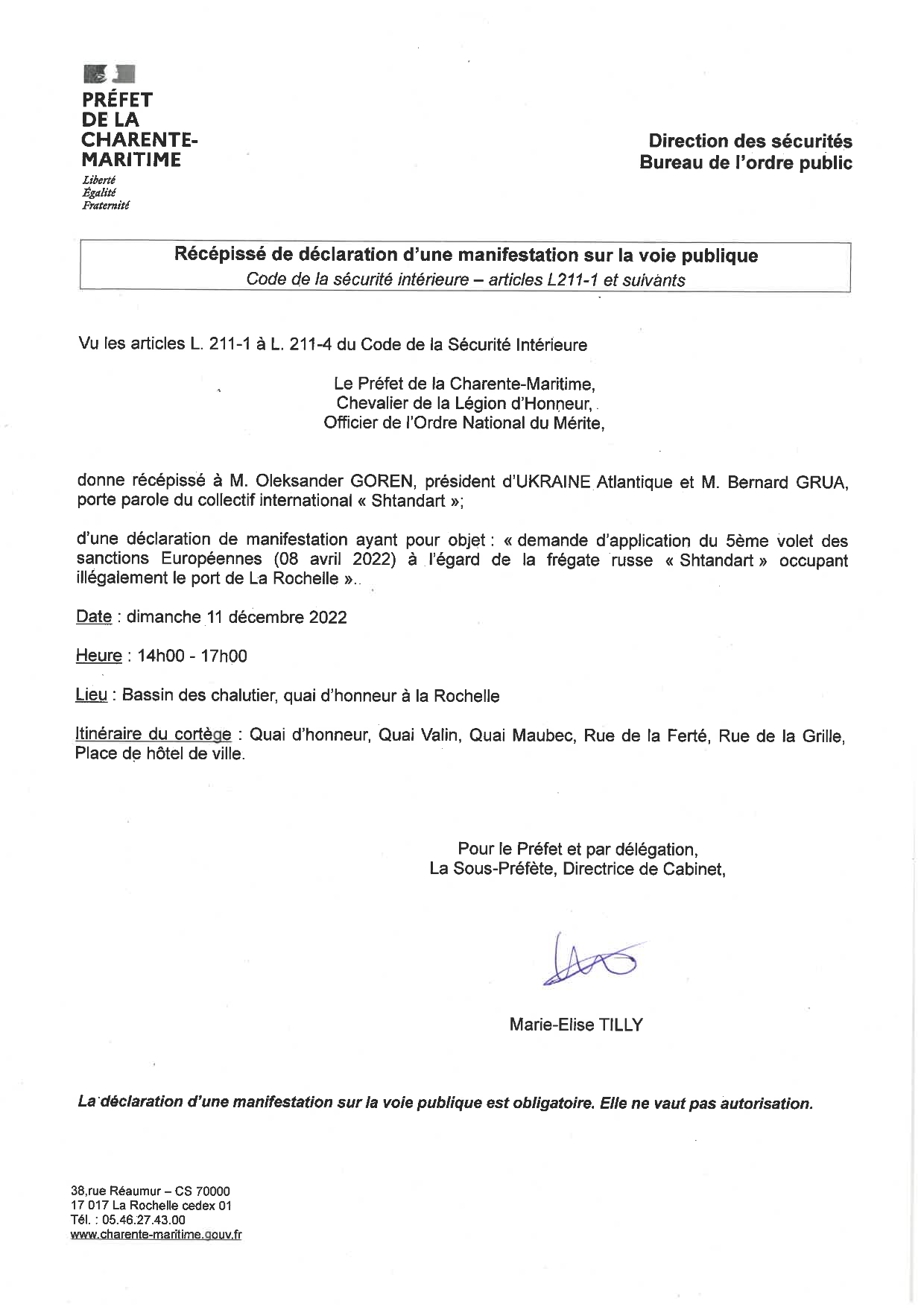 Déclaration de la manifestation à la Préfecture de Charente-Maritime.