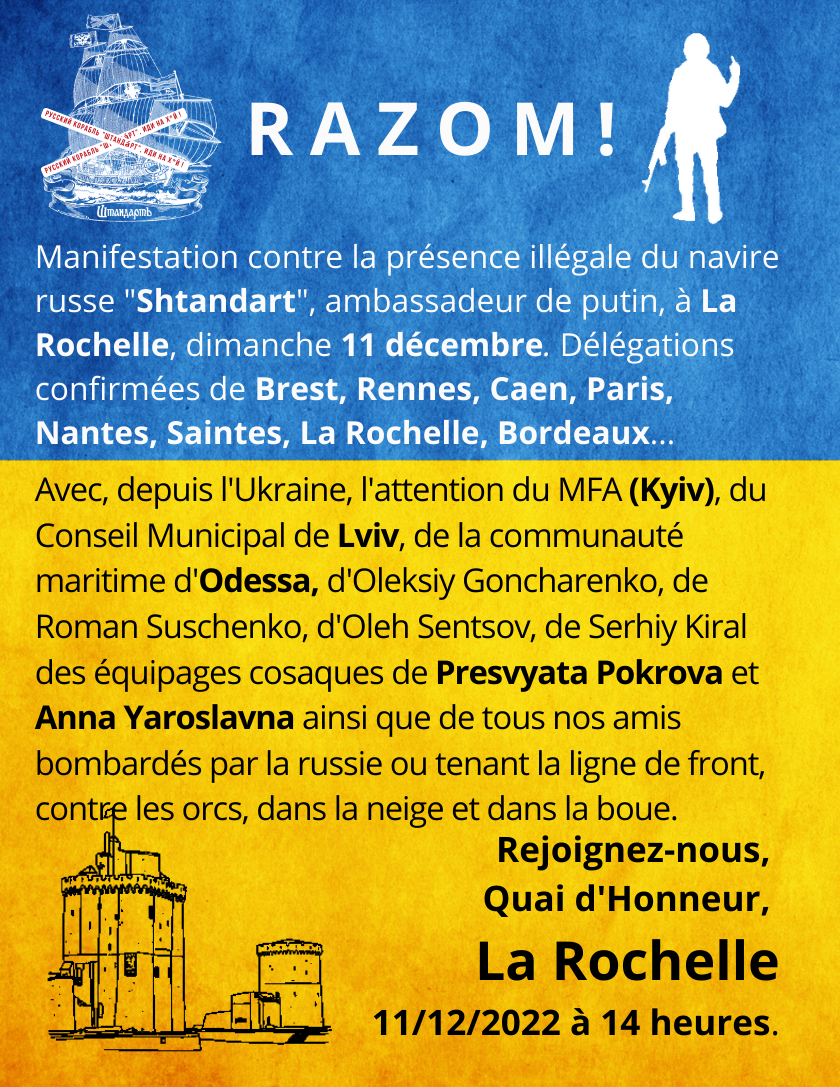 Le viol des sanctions avec les encouragements du maire de La Rochelle et du préfet de Charente-Maritime n’est plus tenable, depuis que la Fédération de Russie a été déclarée « Etat sponsor du terrorisme » par le Parlement européen, le 23 novembre 2022. La position d' »Ukraine Atlantique » et de « No Shtandart in Europe » est que ces deux autorités doivent cesser de recevoir illégalement le Shtandart et qu’il soit mis fin au contournement du 5e paquet des sanctions. Rien d’autre n’est demandé.