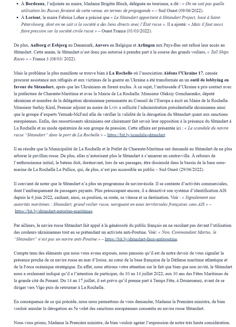 Monsieur le Président, le 23 novembre dernier, le Parlement européen a reconnu que la Fédération de Russie était un état sponsor du terrorisme. Notre collectif se permet de vous demander que tous les lanceurs d’alertes précités soient, enfin, entendus. Il espère que vous ferez prendre, rapidement, par votre préfet de Charente-Maritime, Nicolas Basselier, une mesure d’expulsion du navire russe. Il souhaite, pour le bien de notre pays, que le réseau d’influence construit par et pour le Shtandart, si ce n’est pour l’Etat russe, donne lieu à une enquête concernant la sûreté nationale et que notre gouvernement fasse en sorte que la déplorable affaire de La Rochelle ne soit pas dupliquée dans d’autres ports français.