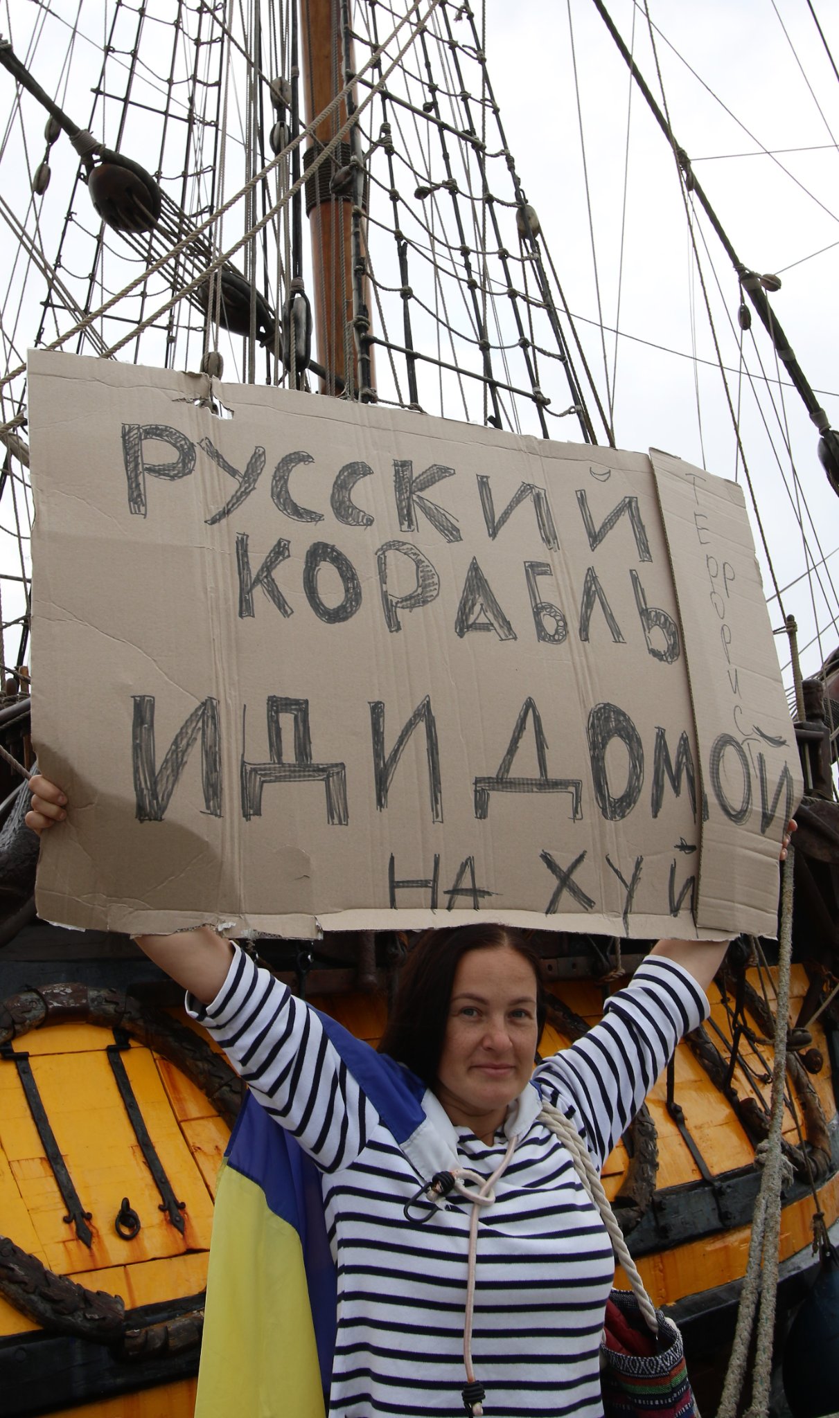« Sur les pancartes, rédigées en russe ou en ukrainien, on pouvait notamment lire « Navire russe, retourne chez toi ». Incompréhensibles pour la majorité des vacanciers (et pour ceux qui se promenaient sur le port), les messages étaient adressés au capitaine et aux réseaux sociaux où l’action a été relayée quasi en direct » (Carole Tymen. Ouest-France, le 16/08/2022)