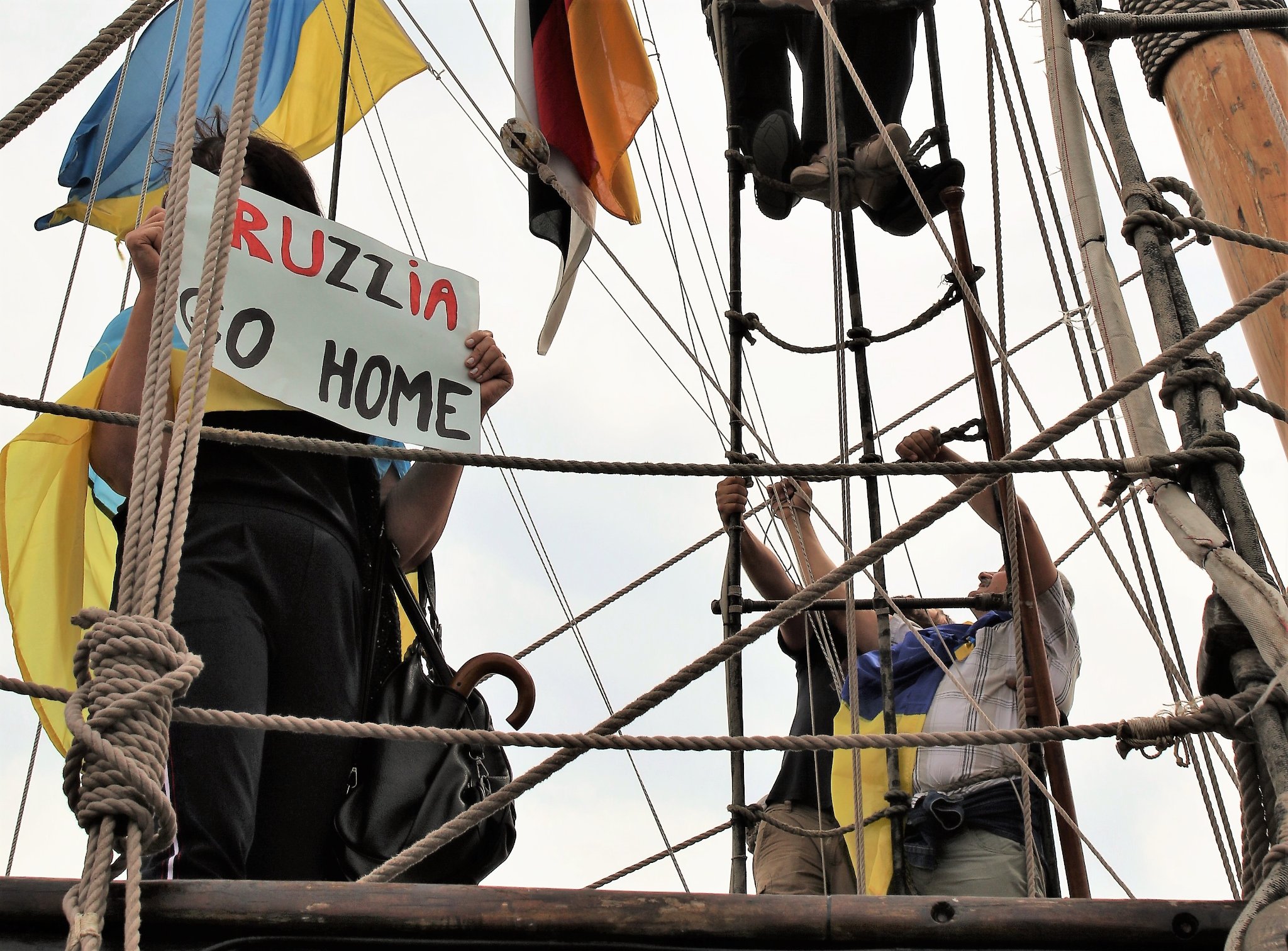 Martus sait à quel point ce commercial mélange russo-ukrainien, bourreau-victime, dégoûte les Ukrainiens, partout où le Shtandart passe. Il n’a cure du fait que ceux-ci ne cessent de le lui répéter. Le 12 juin 2022, la première flashmob des Ukrainiens à La Rochelle demande déjà qu’il n’arbore pas le pavillon ukrainien. Fin juin 2022, La Rochelle interdit au Shtandart de hisser le pavillon russe et le pavillon ukrainien. Le 14 juillet, Douarnenez lui interdit d’exhiber le drapeau russe. A Vigo, le 23 juillet, la guardia civil, à la demande des Ukrainiennes d’AUG Girasol, vient s’enquérir des motifs qui font que le Shtandart ait hissé le pavillon ukrainien. Dans le port de Douarnenez, à la mi-juillet, c’est le pavillon russe qui est interdit. A Camaret le 15 août 2022, Martus doit descendre le pavillon ukrainien à la demande de l’organisation. Mais, dès le lendemain, le 16 août, à Brest, il recommence à hisser le pavillon russe ET le pavillon ukrainien.