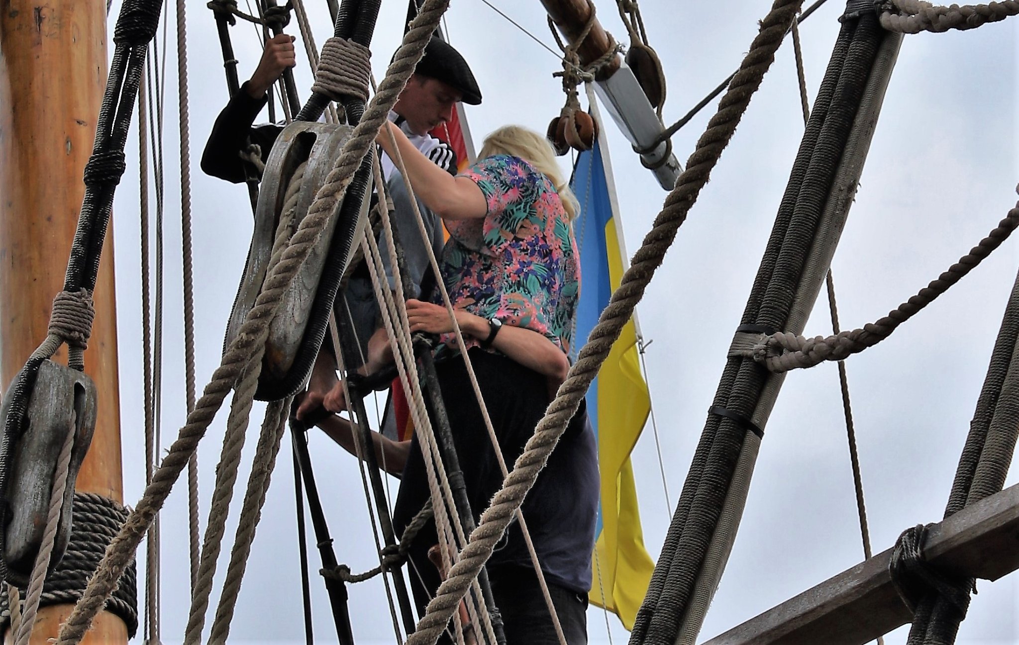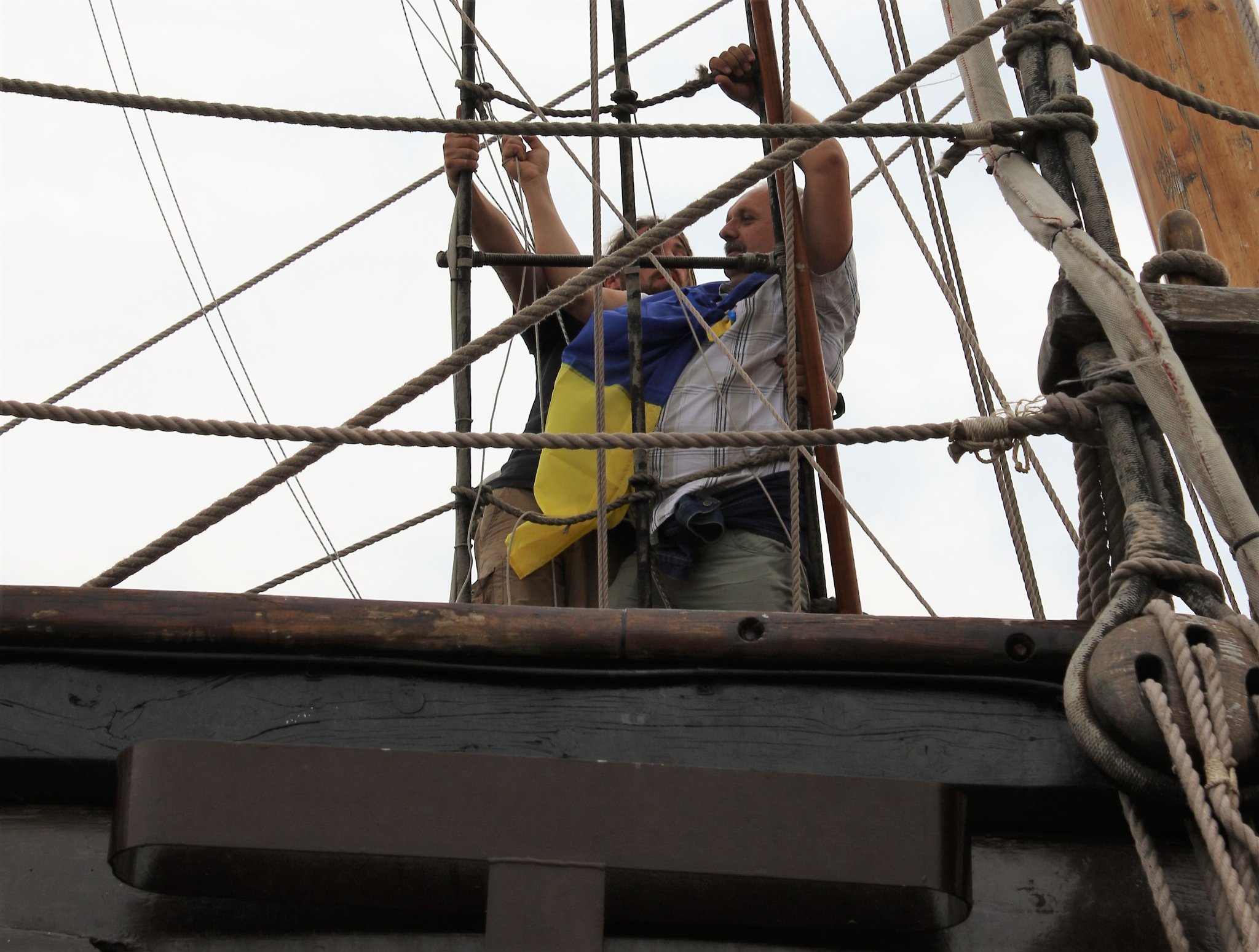 Devant l’entêtement de Martus, une femme, Svitlana, et un homme, Micha, ont commencé à escalader les enfléchures (et non pas le mât) pour décrocher les couleurs ukrainiennes souillées par le navire russe.