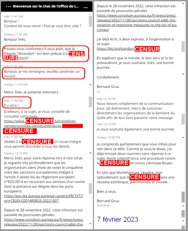 Une manifestation, le 18 mars à Vannes, contre la venue d’un bateau russe à la (censuré) – Ouest-France – 04/03/2023Il y a amalgame : on connaît le capitaine du bateau de longue date, il est invité, il a l’agrément pour participer à la fête, il viendra tant qu’aucune décision étatique ne nous l’interdit« , indiquaient les organisateurs samedi soir.