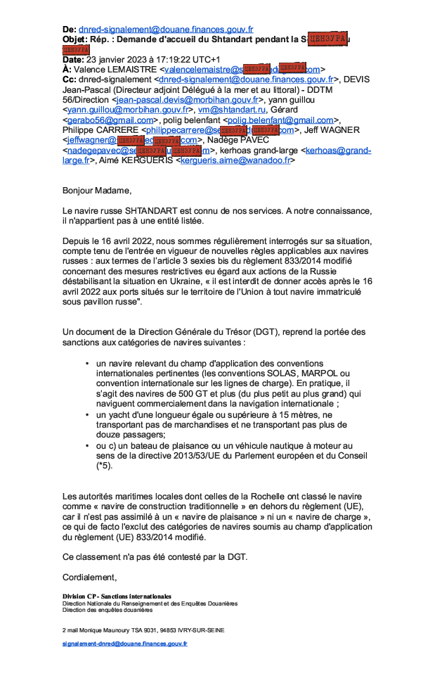 Le texte européen ne reconnaît aucune dérogation ou exclusion pour les répliques historiques, les navires-écoles, voire les navires se proclamant, depuis le 27 février 2022, « opposants » au régime russe. Le document de la « Direction Nationale du Renseignement et des Enquêtes Douanières » (DNRED), en annexe, fait usage des termes « entités listées » et « catégories » qui ne figurent pas dans le dit règlement européen, lequel vise à l’exhaustivité. Se limitant aux navires de charge de 500 GT et plus, ainsi qu’aux navires de plaisance, le courrier de la DNRED est une réécriture trompeuse, dans un sens restrictif et de contournement, du texte des sanctions.