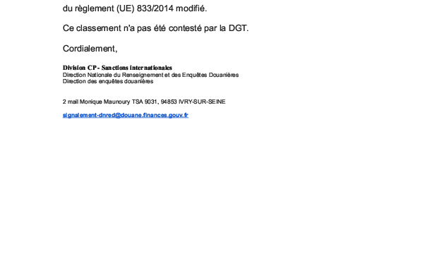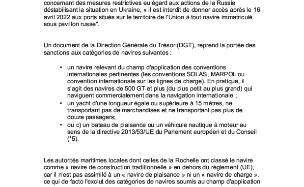 The European text does not recognize any derogation or exclusion for historical replicas, training ships, or even ships proclaiming themselves, since February 27, 2022, as « opponents » of the Russian regime. The document of the « National Authority of Intelligence and Customs Investigations » (DNRED), in exhibit, uses the terms « listed entities » and « categories » which do not appear in the said European regulation aiming at exhaustiveness. Limiting itself to cargo vessels of 500 GT and more, as well as to recreational vessels, the letter from the DNRED is a misleading rewriting of the text of the sanctions, in a restrictive and circumventing sense.