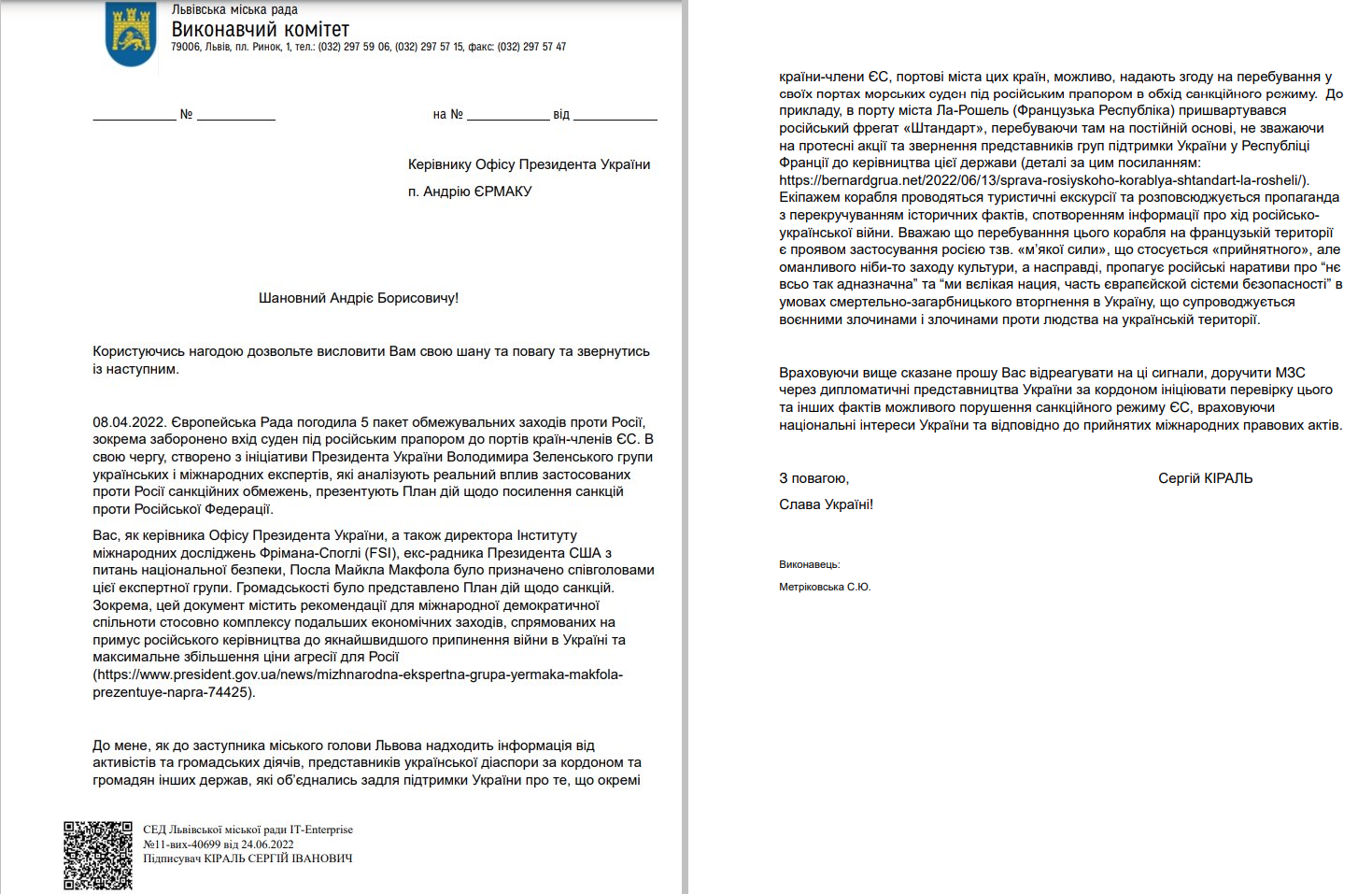 Dans le cadre de l’affaire du navire russe «Shtandart» dans le port de La Rochelle, la municipalité de Lviv demande à l’administration présidentielle ukrainienne, au groupe d’expert Yermak-MCFaul et à la Commission européenne de vérifier, dans tous les ports de l’Union européenne, qu’il n’existe pas d’infraction au cinquième volet des sanctions européennes.