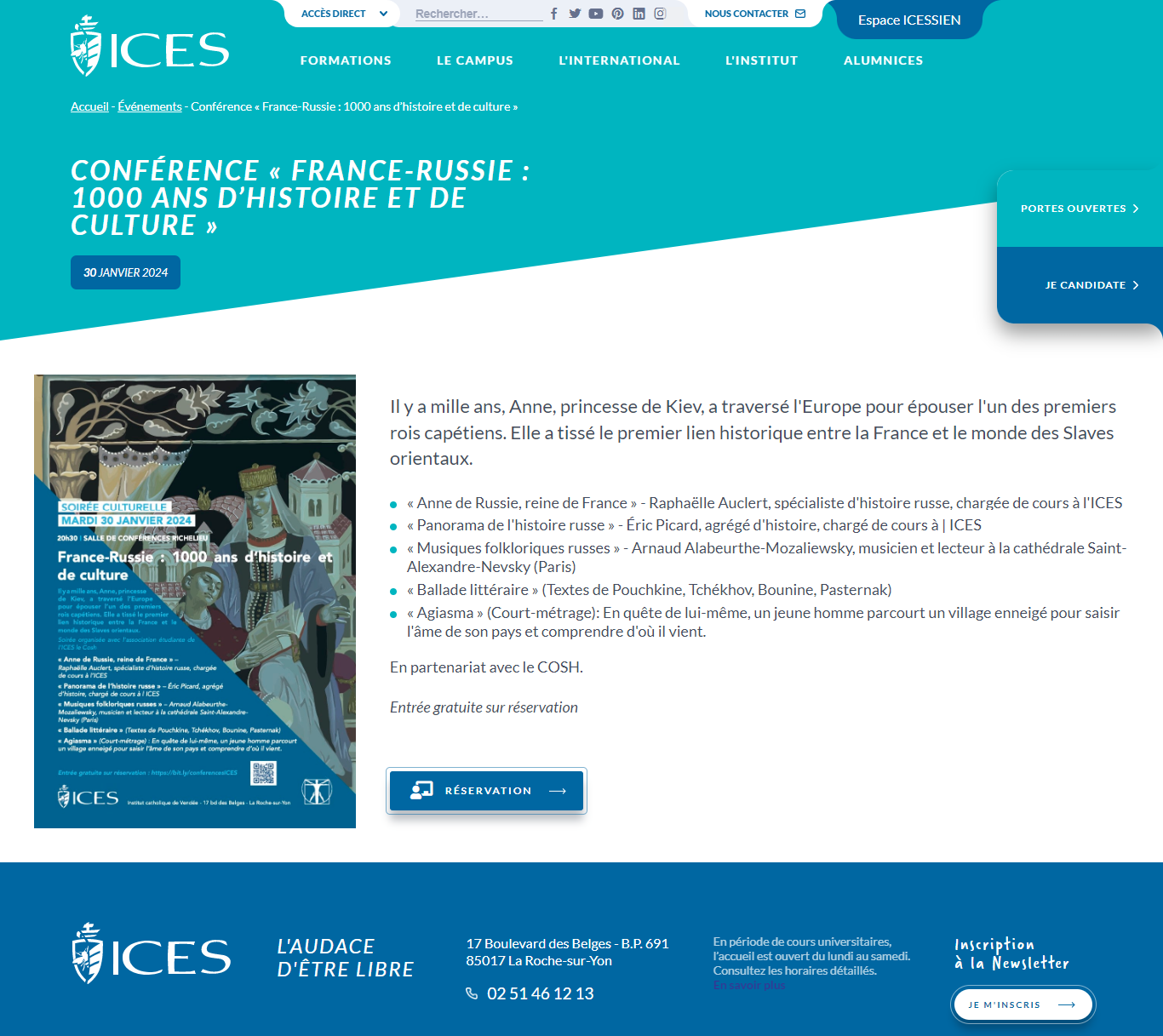 Mais, nous tenons à vous exprimer notre tristesse à propos de l’événement prévu le 30 janvier 2024 à l’Institut catholique de Vendée : La Conférence « France-Russie : 1000 ans d’histoire et de culture » https://ices.fr/evenements/conference-russie-histoire-culture/.
