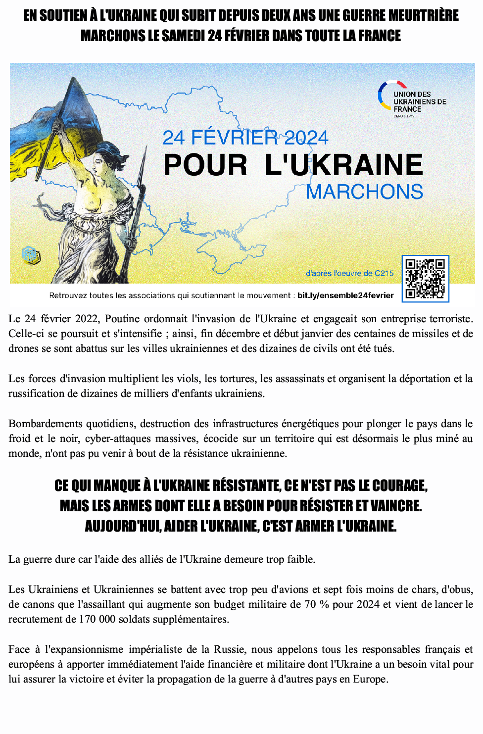 Le 24 février 2022, Poutine ordonnait l’invasion de l’Ukraine et engageait son entreprise terroriste. Le collectif national https://bit.ly/ensemble24fevrier, initié par l’Union des Ukrainiens de France dans le cadre de la campagne internationale #StandWithUkraine de l’Ukrainian World Congress présente, au 13/02/2024, 67 événements et regroupe 135 associations, syndicats et organisations, dans 49 villes. Il appelle à une grande mobilisation populaire en défense de l’Ukraine, lors du deuxième anniversaire du déclenchement de la guerre à grande échelle lancée par la Russie.