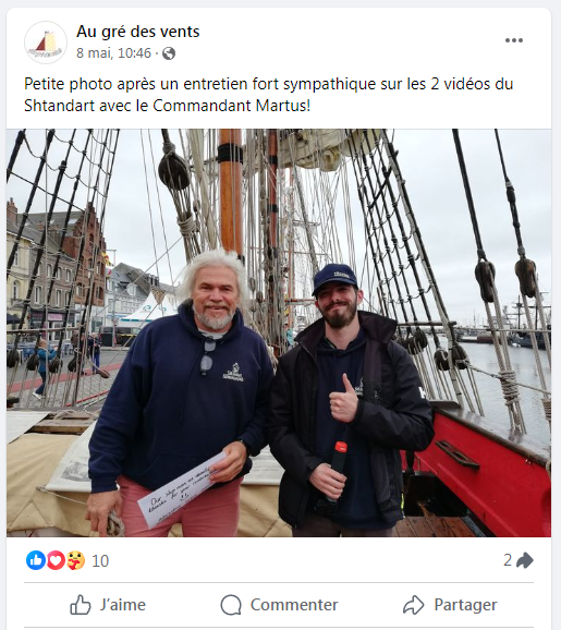 Cette vidéo a été partagée par les pages Facebook de l’association Amis des Grands Voiliers, gérée par Michel Balique, et par celle du Shtandart.
