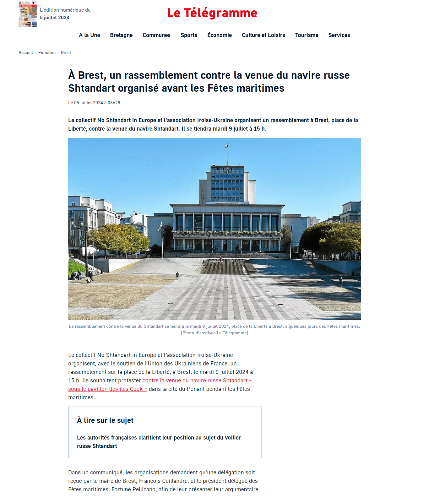 L’association « Iroise-Ukraine » et le collectif lanceur d’alerte « No Shtandart In Europe », avec le soutien de l’« Union des Ukrainiens de France », organisent un rassemblement le mardi 9 juillet 2024, à 15 h 00, place de la Liberté, Brest. L’événement a pour objet de demander le respect, par la ville de Brest et par les Fêtes Maritimes de Brest, du 5e volet des sanctions pris à la suite des massacres de Boutcha. Celui-ci, tel que présenté dans l’article 3 sexies bis du règlement UE n°833/2014, interdit la présence dans les ports de l’Union, à compter du 16/04/2022, de « TOUT navire immatriculé (au 24/02/2022) sous pavillon russe ». Le communiqué de presse de l’événement est consultable en ligne :