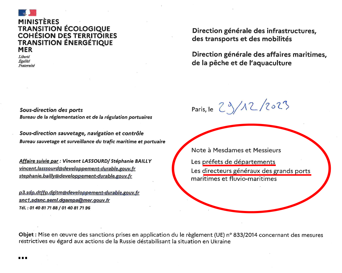 https://drive.google.com/file/d/1BS3AXw0VnQa-m8wCUxxAwvn1Y_f2bfGC/view ↩︎ - Direction générale des infrastructures, des transports et des mobilités (DGITM) & Direction générale des affaires maritimes, de la pêche et de l’aquaculture (DGAMPA) : circulaire de mise en œuvre des mesures de sanction en application des règlements européens et listes des navires interdits