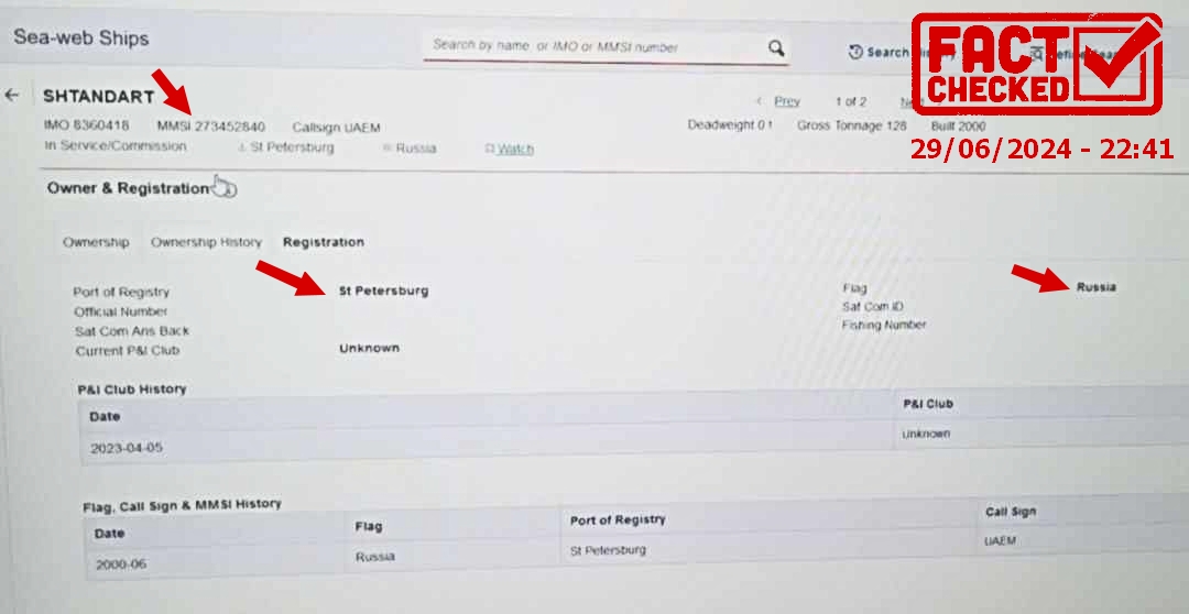- Докази того, що « Штандарт » ходить під фальшивим прапором і внесений до чорного списку французьких морських властей.