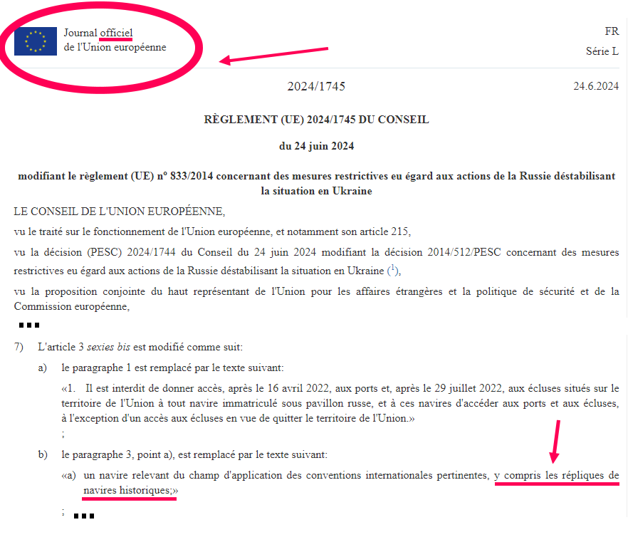 - Поправка Європейської Ради « Копії історичних кораблів » від 24.06.2014 р. до Регламенту ЄС № 833/2014, яка конкретно стосується « Штандарту »,