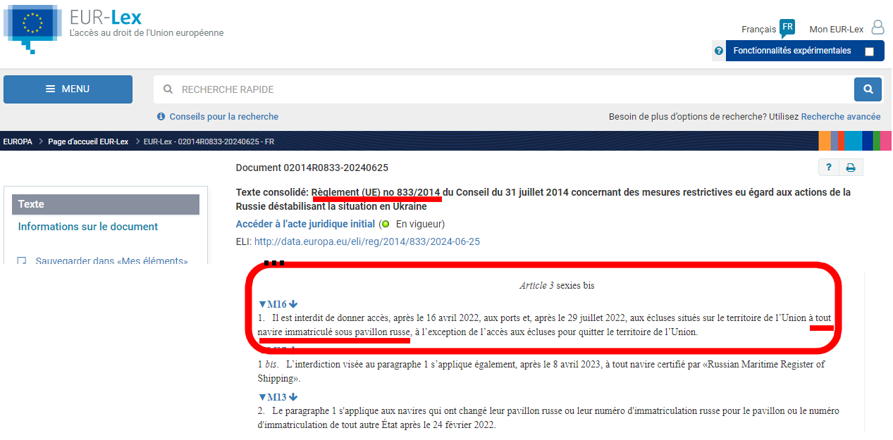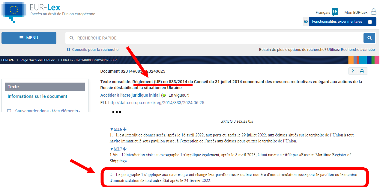- Текст Регламенту ЄС № 833/2014, який передбачає, що зміна прапора не виводить судно зі сфери дії санкцій,