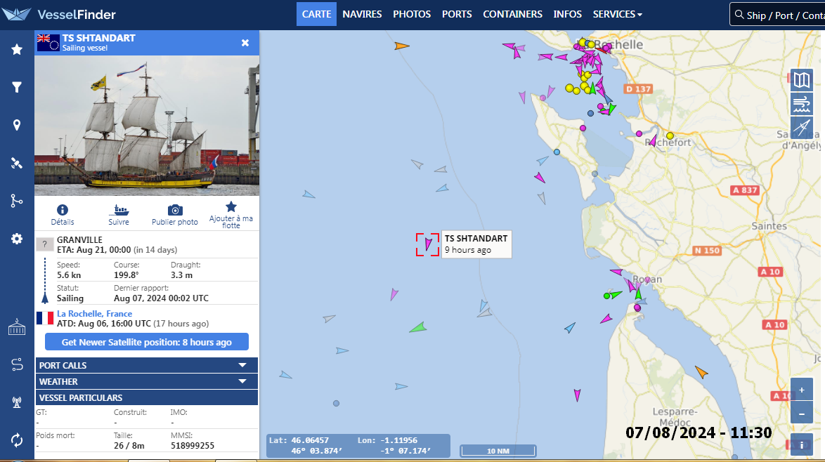 Faisant suite à nos échanges d’hier, je vous informe que le Shtandart a quitté le port de La Rochelle où il jouit d’un important réseau de complicités aussi bien dans la municipalité que chez les représentants de l’Etat. Pourtant largement pourvu à Cee, Espagne, pour la lointaine destination de Belfast (750 mn) selon le récit d’El Faro de Vigo, le navire russe a complété son avitaillement afin de continuer à mener sa campagne d’ingérence le long des rivages de Premar Atlantique Ceclant ainsi que de Premar Manche et dans nos ports. De plus, dans le port de Charente-Maritime, il a embarqué de nouveaux clients, camouflés sous le nom « d’équipage ». Ne doutons pas qu’ils soient les pions d’un prochain chantage « humanitaire » sur les côtes de Nouvelle-Aquitaine, des Pays de la Loire, de Bretagne ou de Normandie.